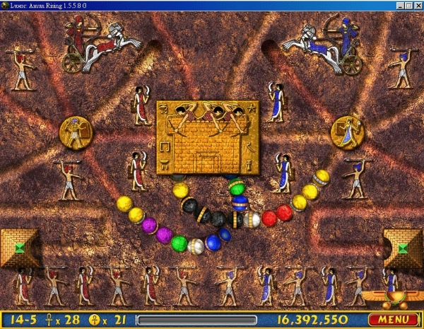 畫面堪稱精細,我覺得比起另一個很有名的小遊戲ZUMA來說,Luxor的音效和背景處理有趣多了,可能是因為我很喜歡古埃及這類的主題吧!每次只要看到姿勢詭異的埃及人壁畫就忍不住地想偷笑。眼線畫那麼長,化妝品應該消耗得很快喔?