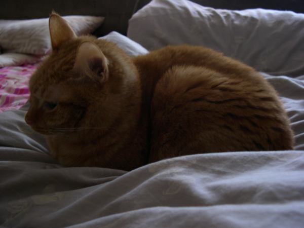 椪柑最喜歡的地方就是電視機上方,熱熱的便於取暖。之前我家的電視是舊型的傳統映像管,體積非常地有存在感,三隻貓硬擠在電視機頂端都沒問題;現在換了新的液晶電視之後,已經變成超薄型了,其他的貓都各自尋覓溫暖好睡覺的地方,只有椪柑堅守原則:老娘一定要睡在電視機上面,當一隻貫徹始終的輻射貓,喵!所以常常以披垂的姿態掛在電視螢幕頂妨礙收視。不掛在電視上吸收輻射線時,她喜歡縮成一團,把四隻腳都巷內彎藏起來,頭縮的離身體很近,搭配上牠老是蓬鬆的毛和顏色......