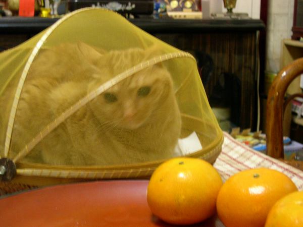 那是一種在東南亞地區到處可見的器皿,上面的網罩可以打開或蓋上,具有防蚊效果。某日我媽拜拜完,把一桌子的薩摩蜜柑都放到防蚊籃裡;「真‧椪柑」看到神奇的籃子,非常地興奮,覺得這個籃子根本就是為他量身訂作的,就開心地自己跑到籃子裡面去窩著。