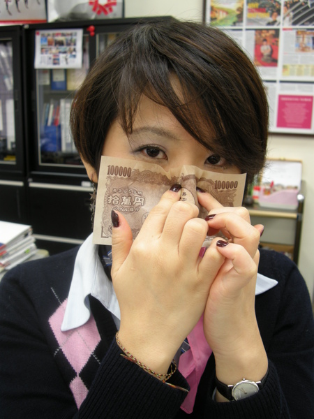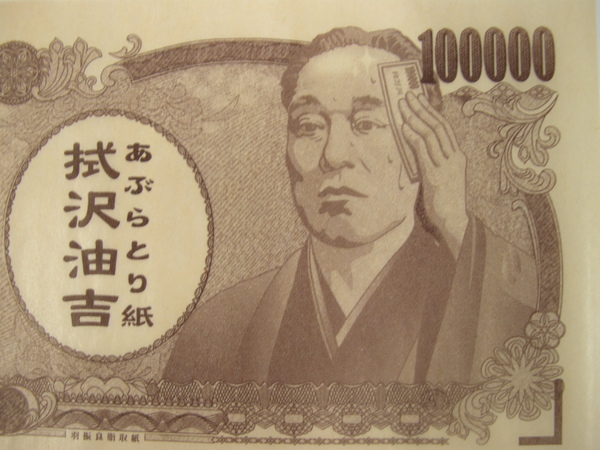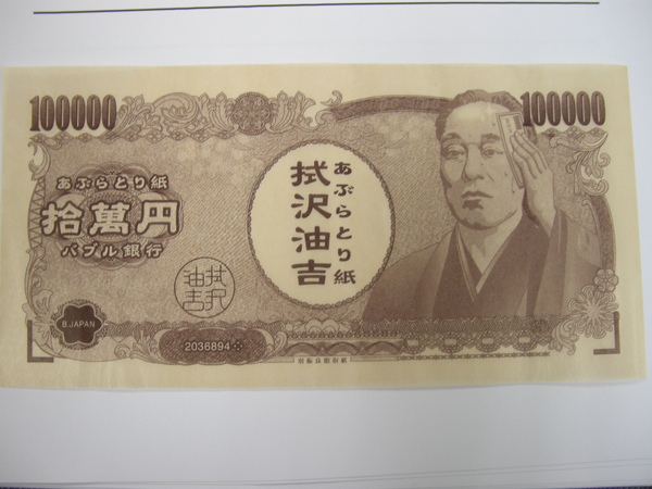 這…這張日幣怎麼看起來有點怪怪的呢?沒錯,各位看倌,這是一張不折不扣的吸油面紙,由宅宅們很熟悉的日本知名玩具廠萬代公司(BANDAI)榮譽出品。燒萬圓日鈔取暖不稀奇,看清楚了,這可是個用十萬圓日鈔當吸油面紙的小妞啊!!!