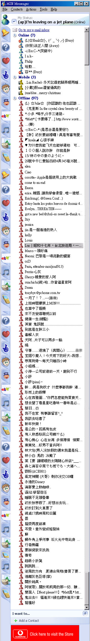 不知道和我人在國外有沒有關係,不過我發現即使是身在台灣的友人也很愛用外國語(多半是英文)來當作自己在MSN上的名字。簡單地算了一下,107人中有35位是使用外文當作自己的MSN暱稱,佔了32%左右;而這35位裡面只有9個人是不得不使用外文的,包括一位西班牙人(人家不能輸入繁體中文不能怪他啊...),一個交了日本女友的同學 (攸關生存不得不使用第二外語使用的必要性),其他6個人都是身在美國或英國,考量他們名單上有其他看不懂中文的接收者,而把MSN名稱改成英文。這七個人裡面,有六個人的MSN名稱都是他們自己的英文名字。